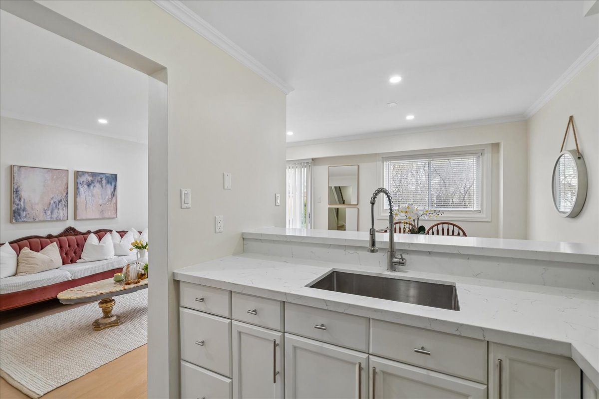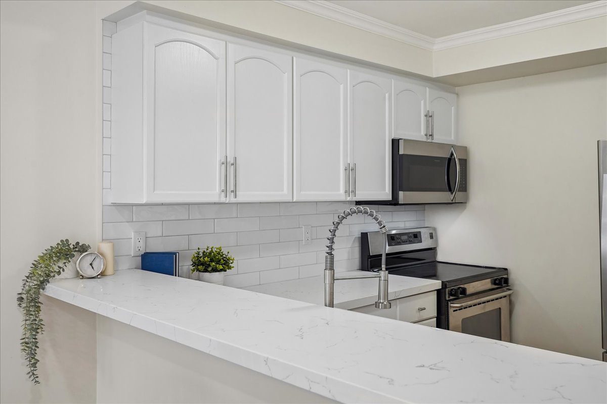 The updated kitchen includes professionally refinished cabinetry, new quartz countertops, new subway tile backsplash, an undermount stainless steel sink, and stainless steel appliances. Additionally, the layout offers plenty of prep space for everyday cooking and weekend entertaining.